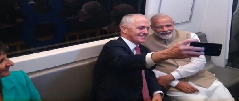 | भारत के चार दिवसीय दौरे पर भारत पहुंचे ऑस्ट्रेलियाई प्रधानमंत्री मैल्कम टर्नबुल ने आज प्रधानमंत्री नरेंद्र मोदी के साथ दिल्ली मेट्रो में सफर किया| दोनों नेताओं ने मंडी हाउस से अक्षरधाम मेट्रो स्टेशन तक का सफर किया| इस दौरान दोनों नेताओं ने एक दूसरे के साथ सेल्फी खींची और उसे ट्विटर पर शेयर किया| सफर के दौरान प्रधानमंत्री नरेंद्र मोदी ने अपने ट्विटर हैंडल से शेयर किया -"ऑस्ट्रेलियाई पीएम मैल्कम टर्नबुल के साथ दिल्ली मैट्रो में हूं, हम अक्षरधाम मंदिर की तरफ जा रहे है|"