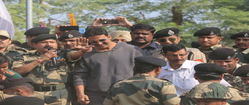 भारत-पाकिस्तान के बीच सीमा पर बने तनाव के बीच फिल्म बॉलीवुड अभिनेता अक्षय कुमार सीमा सुरक्षा बल (बीएसएफ) के जवानों से मिलने के लिए आज जम्मू के फ्रंटियर बीएसएफ मुख्यालय में पहुंचे। यहां उन्होंने पाक फायरिंग में शहीद जवान गुरनाम सिंह, जितेंद्र कुमार और सुशील कुमार को श्रदांजिल दी। साथ ही जवानों से मिलकर उनका हौसला बढ़ाया। जवानों से मिलने पहुंचे अक्षय के पडांल में पहुंचते ही 'भारत माता की जय' के नारे गुंजने लगे और जवान तिंरगा लहराने लगे।