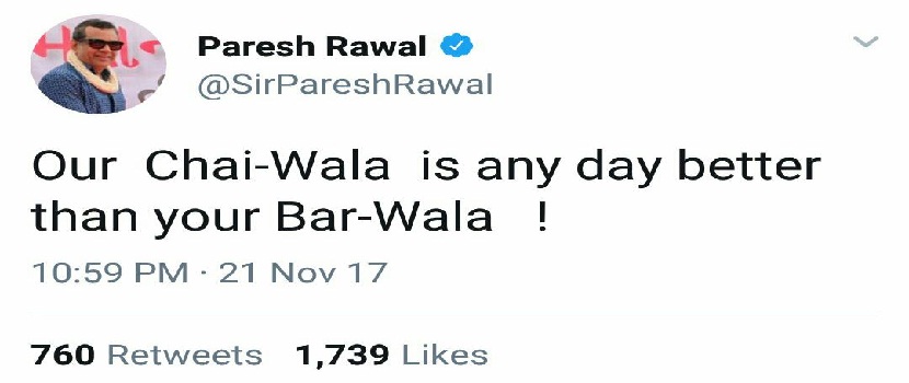 | BJP नेता परेश रावल ने किया "चायवाला-बार-वाला" ट्वीट, Delete कर मांगी माफी | ||