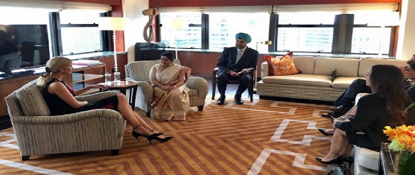 | अमेरिकी राष्ट्रपति डोनाल्ड ट्रंप की बेटी और सलाहकार इवांका ट्रंप ने मंगलवार को न्यूयॉर्क में संयुक्त राष्ट्र महासभा सत्र के दौरान भारतीय विदेश मंत्री सुषमा स्वराज से मुलाकात की| इस बातचीत में दोनों ही महिला राजनीतिज्ञों के बीच उद्यमशीलता और कार्यबल के विकास पर बातचीत हुई| इतना ही नहीं इस विशेष मुलाकात के बाद इवांका ने सुषमा की ट्विटर पर तारीफ भी की|